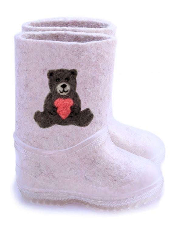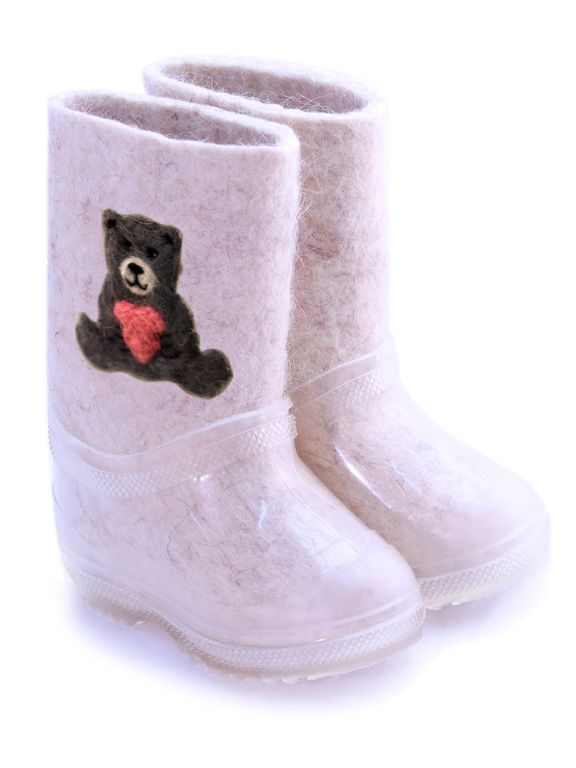В зимнее время года ноги ребенка непременно нужно защитить от холода. С этой задачей прекрасно справятся детские валенки от торговой марки Woole. Валенки для ребенка в своем составе имеют 100% шерсть, они очень мягкие, отлично впитывают влагу, при этом сами валенки быстро ее испаряют, что не дает ногам замерзать. Валенки «Медвежонок с сердечком» из натурального войлока ручной валки продаются вместе с калошами отлично защищены от попадания грязи. Калоши съёмные не скользкие.