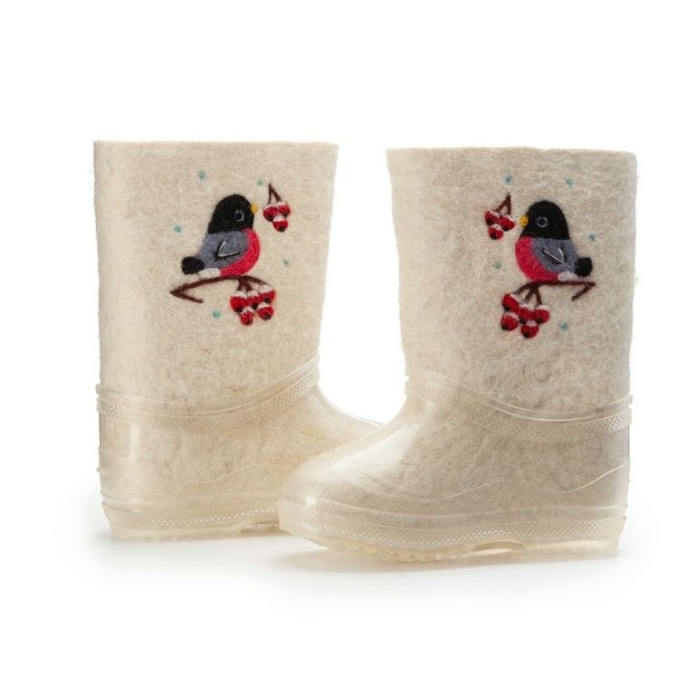 В зимнее время года ноги ребенка непременно нужно защитить от холода. С этой задачей прекрасно справятся детские валенки от торговой марки Woole. Валенки для ребенка в своем составе имеют 100% шерсть, они очень мягкие, отлично впитывают влагу, при этом сами валенки быстро ее испаряют, что не дает ногам замерзать. Валенки «Снегири на рябине» из натурального войлока ручной валки продаются вместе с калошами отлично защищены от попадания грязи. Калоши съёмные не скользкие.