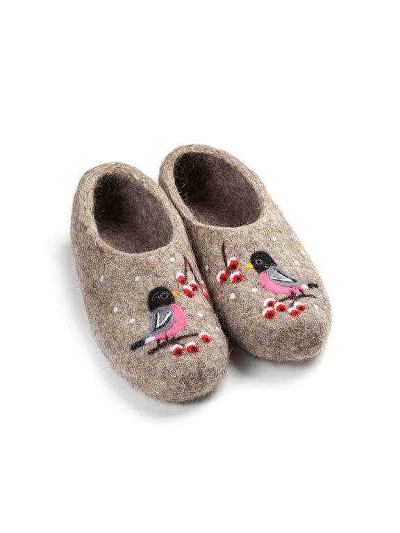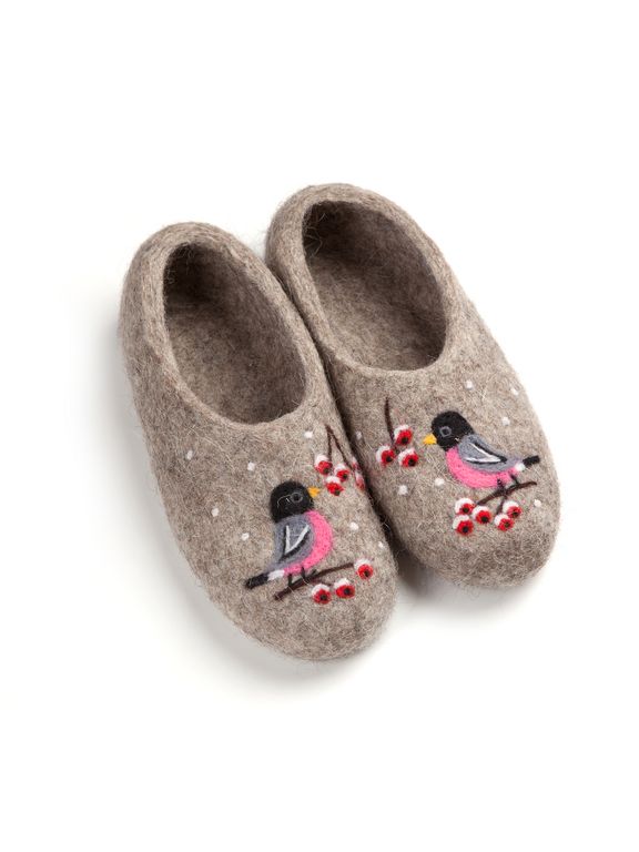 Тапочки домашние «Снегири» прекрасно подходят для дома. В составе 100% шерсть, поэтому женские тапочки от торговой марки Woole прекрасно согреют зимой и не дадут ногам потеть даже летом. Подошва мягкая, не скользит даже на плитке или линолеуме, стелька не предусмотрена. Выбирать тапочки из натурального войлока нужно в соответствии с размером обуви, которую вы носите. Домашние валенки представлены в нескольких цветовых вариациях – синий, серый и бежевый.
